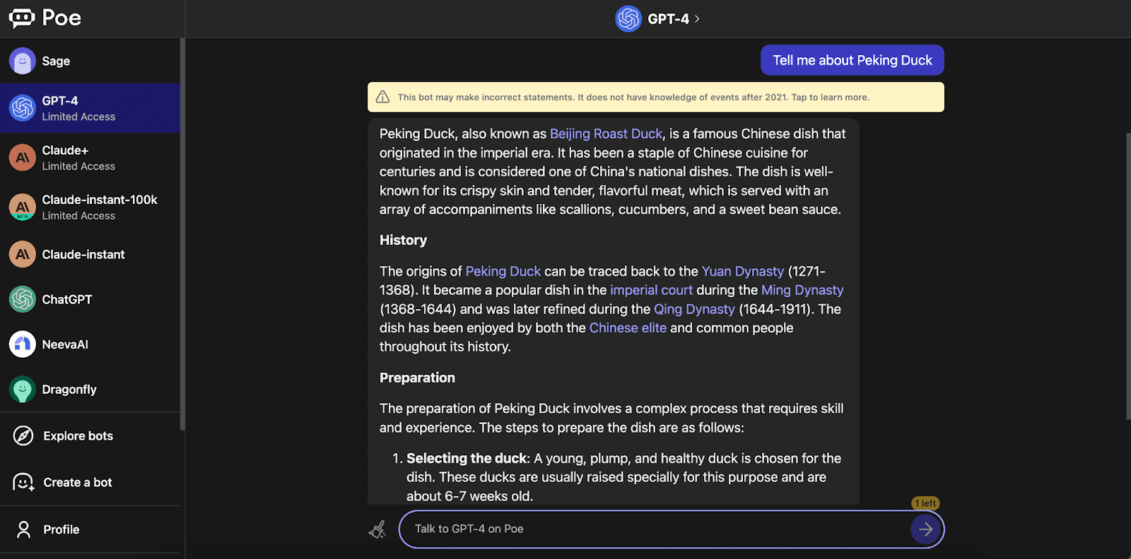 Created by the question-and-answer website Quora, Poe is an AI chatbot app that can be a valuable tool for students. With its user-friendly interface, Poe allows students to ask questions and receive answers from a variety of AI chatbots, including ChatGPT and directly from GPT-4. This means that students can seek assistance on a wide range of subjects and topics, gaining instant access to information and support. Whether they need help with problem-solving or understanding complex concepts, Poe’s AI models can provide guidance and explanations. Additionally, the app's social components enable students to connect with others, follow profiles of interest, and share model output, fostering a collaborative and learning-focused community.