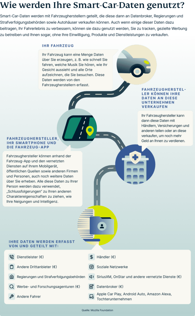 Diese Fahrzeughersteller erfassen eine Vielzahl von Daten über deren Fahrer und Beifahrer, einschließlich Standortdaten, Fahrgewohnheiten und sogar persönliche Daten wie Rasse sowie ethnische und religiöse Zugehörigkeit. Sie geben diese Daten außerdem an zahlreiche Drittanbieter wie Datenbroker, Strafverfolgungsbehörden und Versicherungen weiter.