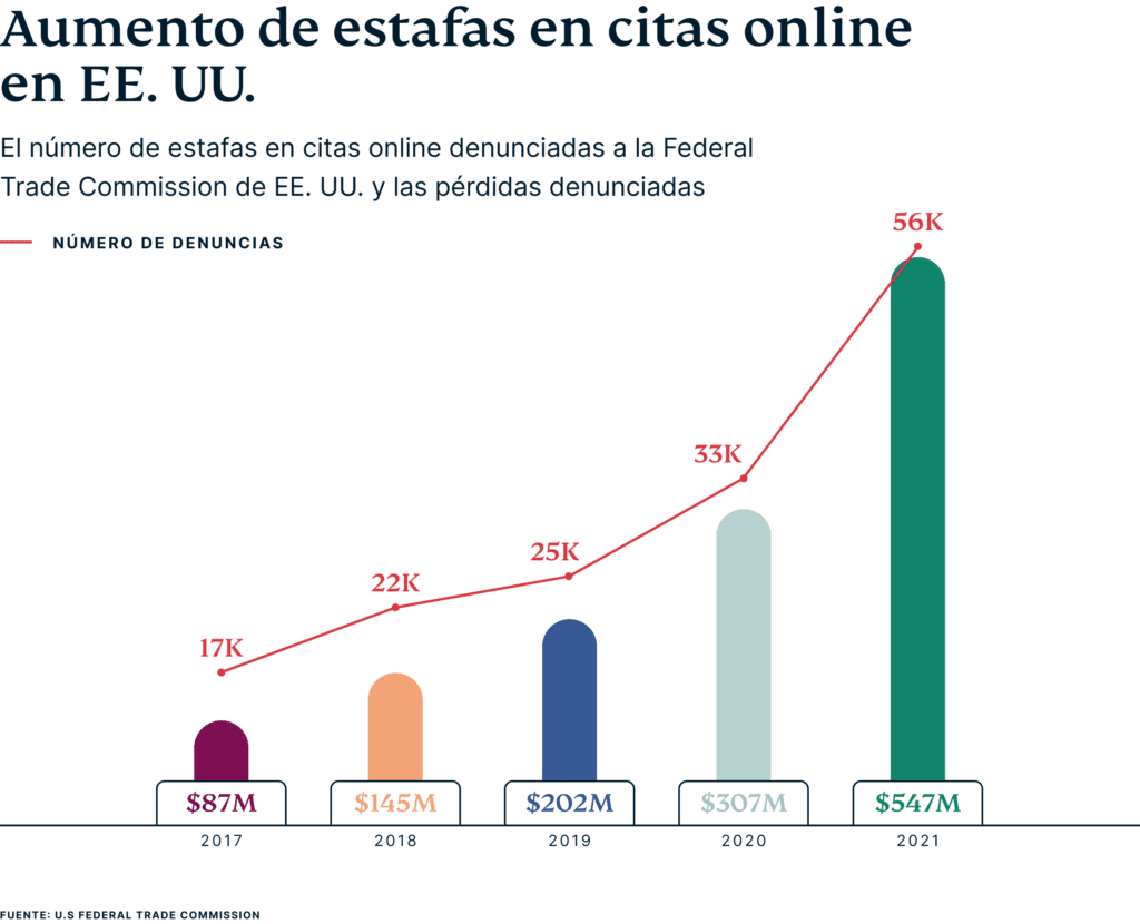 De hecho, según un informe publicado por la Comisión Federal de Comercio de Estados Unidos (la FTC, por sus siglas en inglés) sobre las estafas románticas, tan solo en 2021 se perdieron aproximadamente 547 millones de dólares a causa de los estafadores de citas: un aumento del 80% en comparación con el año anterior, y una cifra que se espera irá en aumento a medida que más usuarios se registren en sitios de citas online.
