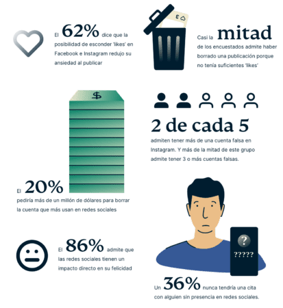 Pero ¿cómo les afecta esto? ¿Cómo influye en su comportamiento el tener que estar al día con tantas redes? La mayoría de los encuestados admiten que el uso de las redes sociales tiene un impacto directo en su felicidad, autoestima y nivel de ansiedad. Las últimas actualizaciones de Instagram o Facebook, que permiten ocultar la cantidad de "likes" que recibe una publicación, han contribuido a reducir un poco la sensación de competencia relacionada con la popularidad de una publicación.