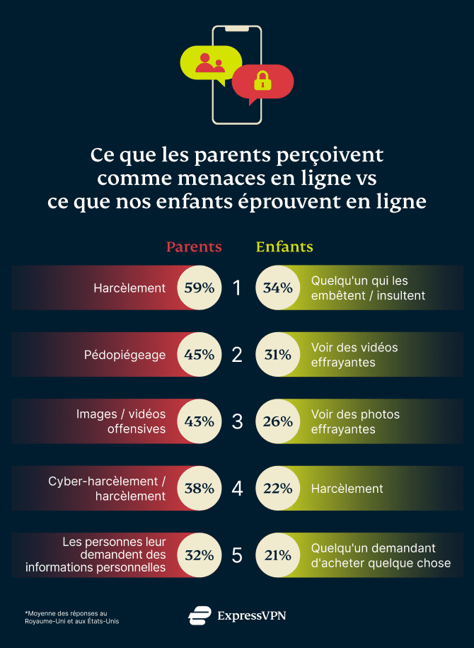 Lorsque nous avons demandé aux parents ce qu'ils considéraient comme une menace en ligne, 59 % des personnes interrogées ont répondu qu'elles craignaient surtout que leurs enfants soient victimes de harcèlement. Viennent ensuite la crainte que les enfants soient victimes d'un cyberprédateur, la peur qu'ils tombent sur des contenus choquants en ligne et le cyberharcèlement.