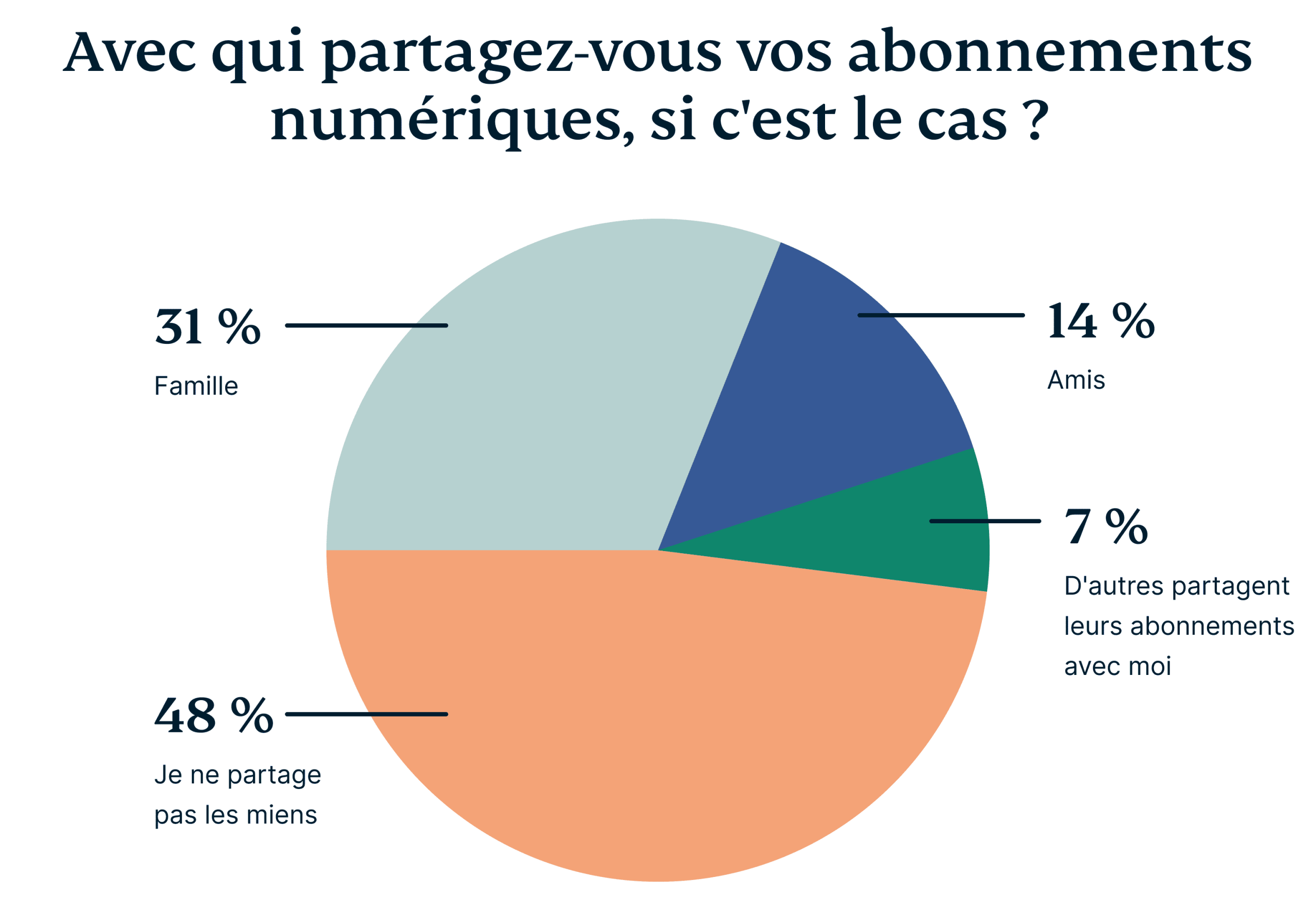 Selon notre sondage, 31 % des personnes partagent leurs abonnements numériques avec des membres de leur famille, tandis que 14 % étendent ce partage à leurs amis. À l'inverse, 7 % des répondants bénéficient des abonnements payés par quelqu'un d'autre. Cela signifie que près de la moitié des utilisateurs sont impliqués dans une forme de partage d'abonnements.