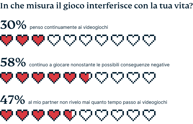 Non riuscire a trovare divertimento al di fuori del mondo dei videogiochi può causare un'ossessione e trascurare attività quotidiane essenziali come mangiare, avere interazioni sociali, dormire e lavorare. È preoccupante che più della metà dei nostri intervistati abbia confessato che spesso continua a giocare ai videogiochi pur sapendo che ciò può influire negativamente sulla propria vita.