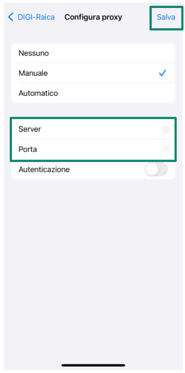 - Inserisci l'indirizzo del server proxy e il numero di porta fornito dal servizio, quindi premi Salva.