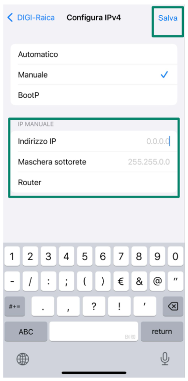 È possibile trovare i dettagli corretti per la maschera di sottorete e per il router controllando le impostazioni Wi-Fi correnti; basta toccare l'icona (i) accanto alla rete in uso.