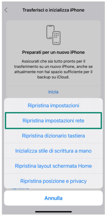 - Scegli Ripristina impostazioni di rete. L'iPhone si riavvierà e le precedenti impostazioni di rete verranno cancellate.