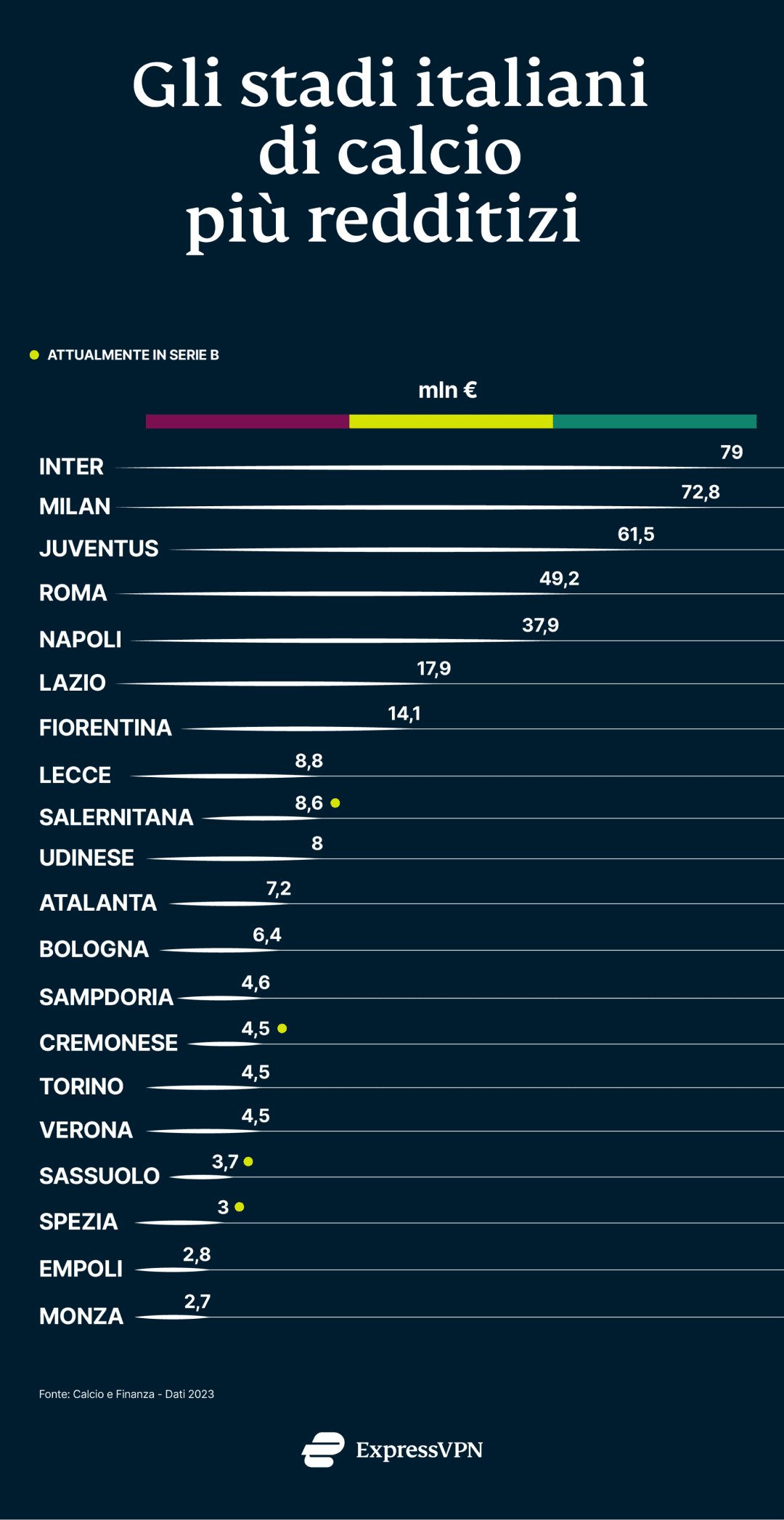 Guardando ai dati del 2023 (quelli consolidati di questa annata arriveranno soltanto tra qualche mese), si nota come in Italia soltanto cinque squadre riescano a “sfondare” il tetto dei 20 milioni di euro incassati in un intero anno solare - con alcune squadre che riescono ad andare ben oltre e con il paradosso delle due primatiste, quelle che fanno meglio, che sognano in realtà di costruire un nuovo stadio per far salire ancora di più le cifre portate a casa dal matchday. Di seguito la classifica completa delle 20 squadre che hanno partecipato alla Serie A 2023-24: