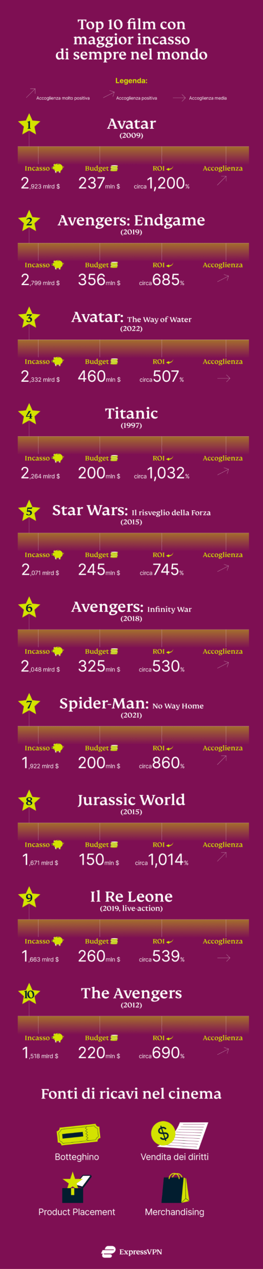 Chi invece ha superato il 1.000% di ritorno dell’investimento, tenendosi stretto il quarto posto nonostante sia il film più “vecchio” nella top-10 di quelli con più incasso al mondo, è “Titanic” - datato 1997 - che ha avuto un impatto culturale che ancora oggi resiste e che, nonostante la lunghezza della pellicola, convinse decine e decine di milioni di persone ad andare a cinema, sfondando per primo nella storia i 2 miliardi di dollari di incasso. Leggermente più indietro troviamo a chiudere la top-5 “Star Wars: il risveglio della Forza” del 2015 - dal successo eccellente, ma paradossalmente “previsto” - data l’enorme attesa per un ritorno sullo schermo così blasonato e una campagna di marketing globale che raramente si era vista per una pellicola. Sesto posto invece per “Avengers: Infinity War” del 2018, che è riuscito a mantenere alte performance (ROI al 530%), nonostante le aspettative sulla pellicola in realtà fossero ancora maggiori, restando in graduatoria davanti a “Spider-Man: No Way Home” del 2021 - primo film citato in questo speciale elenco a fermarsi sotto i due miliardi: 1,922 per l’esattezza, sorprendendo però chi non si aspettava un successo così largo per dei personaggi iconici che mantengono ancora enorme potenziale e attrazione sul pubblico. A proposito di nomi iconici, troviamo subito dopo “Jurassic World” datato 2015 e il “Re Leone” (nella versione live-action del 2019), che però nonostante le cifre simili in valore assoluto - stimate attorno agli 1.6 miliardi - hanno ottenuto “risultati” diversi: il primo con 1.014% di ROI è stato ritenuto sorprendente, il secondo con il 539% è andato sotto le aspettative della Disney. A chiudere poi la top-10 invece c’è “The Avengers” del 2012: un trionfo che con i suoi 1.5 miliardi di dollari ha stabilito un nuovo standard per i film di supereroi.