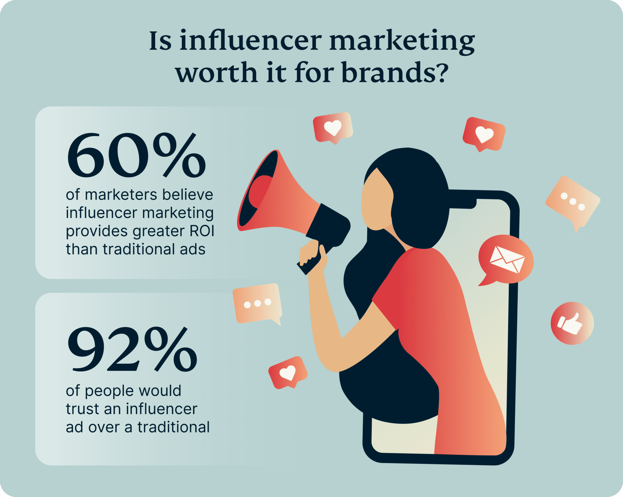 Gli studi dimostrano che il 60% dei responsabili di marketing crede che il marketing degli influencer offra un miglior ROI rispetto agli annunci tradizionali. I consumatori si fidano delle raccomandazioni degli influencer molto più degli annunci tradizionali. In effetti, il 92% delle persone si fida di più della raccomandazione di un influencer rispetto a un annuncio standard. È semplice: le persone sono più propense ad ascoltare qualcuno che seguono e con cui interagiscono quotidianamente rispetto a un marchio che vuole vendere loro qualcosa direttamente.