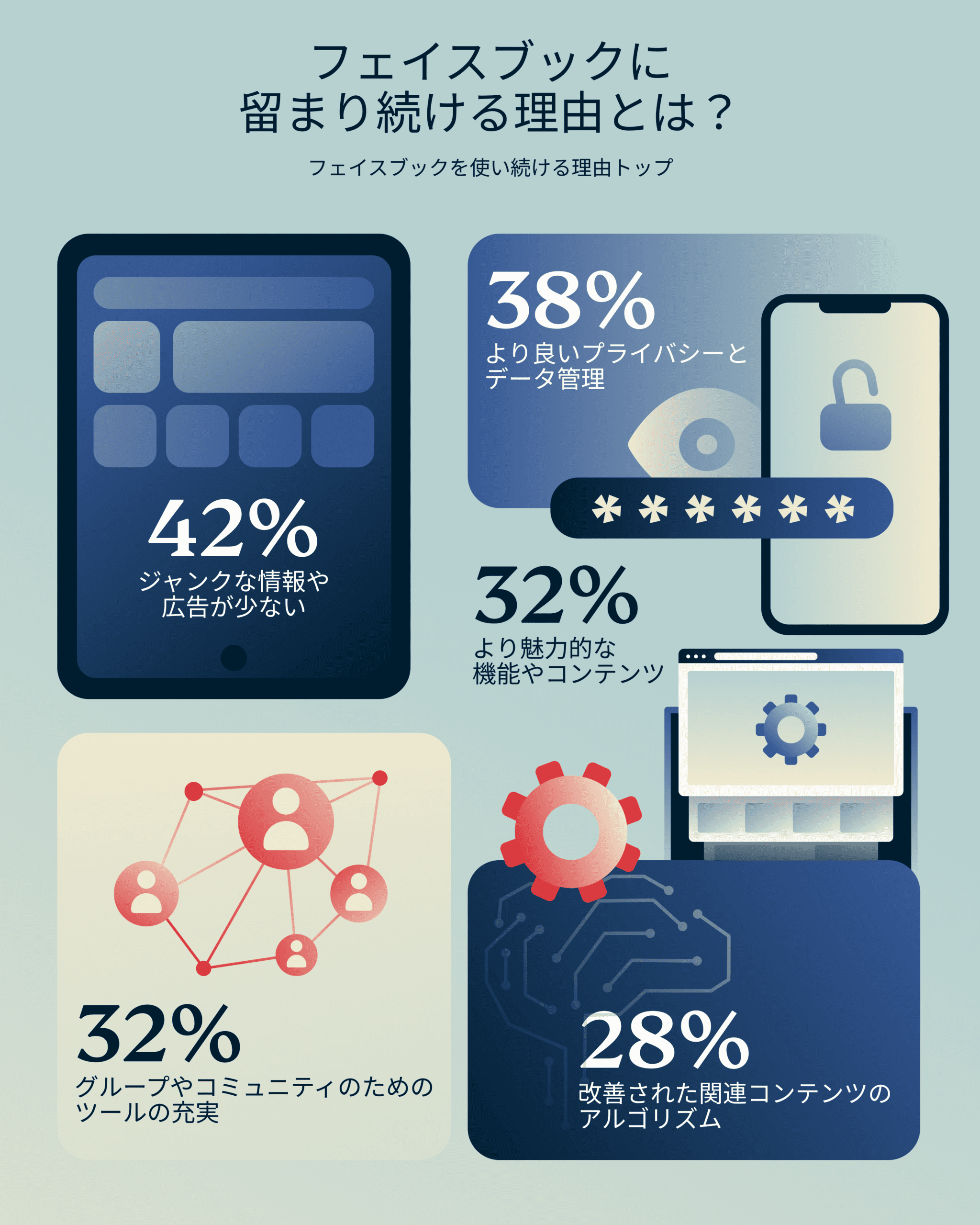 ユーザーはFacebookに求めているものは明確で、使いやすさ、信頼性、そして有益なコンテンツです。世代を問わず、多くのユーザーが「広告を減らしてほしい」「プライバシーを強化してほしい」と考えています。無駄な情報に溢れたり、関心のないコンテンツが支配するのではなく、目的を持ったプラットフォームを求めているのです。