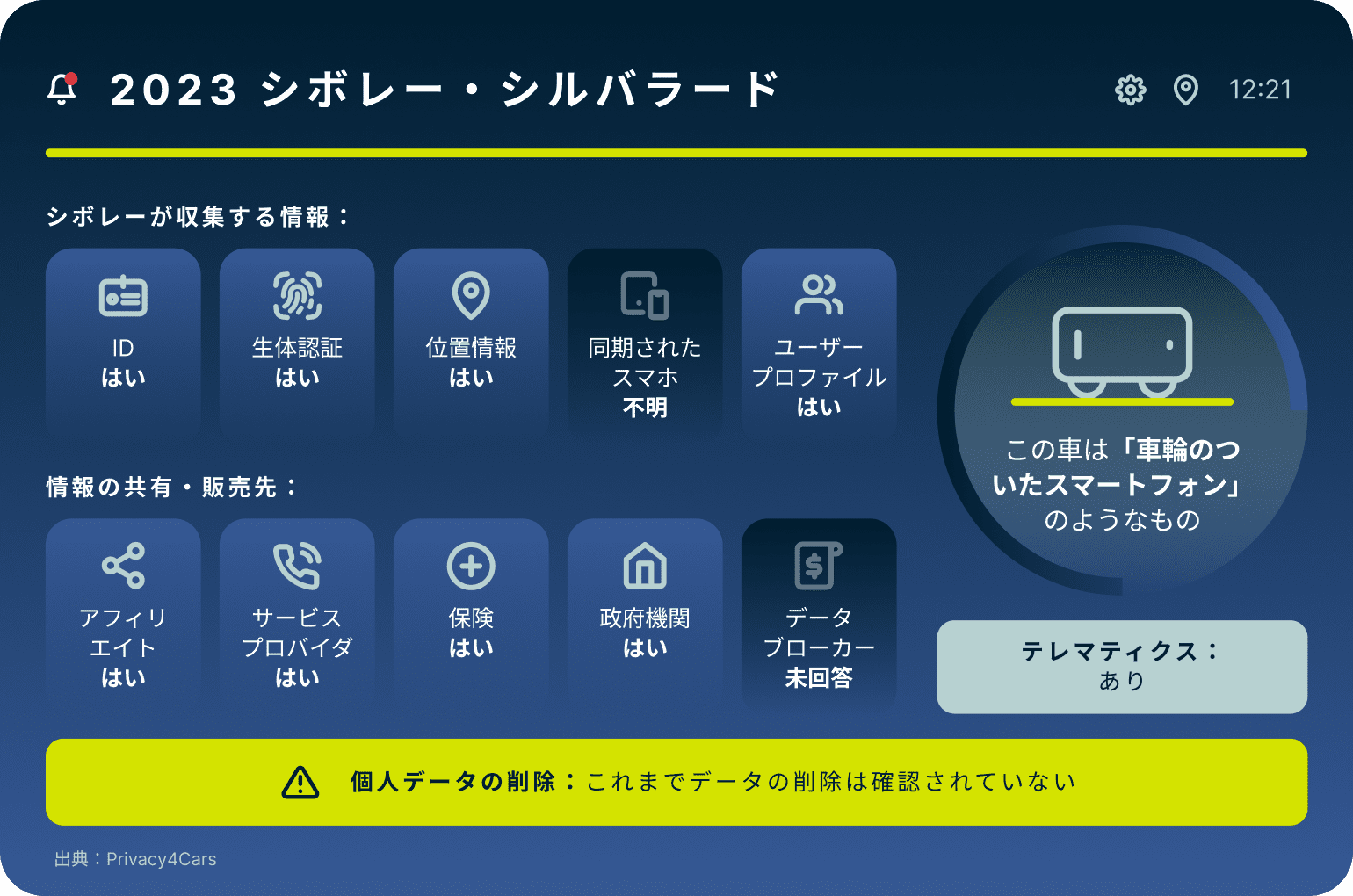 「現代の自動車は膨大な量のデータを収集し、車載やクラウドに無期限に保存しています。データは車だけでなく、その乗員も追跡します。位置情報履歴、電話内容(連絡先、メール、テキストメッセージ、ツイート、ソーシャルメディアのフィード)、音声記録、体重、その他の生体認証データが記録されます。異様に誇張して聞こえるかもしれませんが、実際にそうなのです。多くの場合、車のデータはドライバーではなく、メーカーの利益のために収集されます。