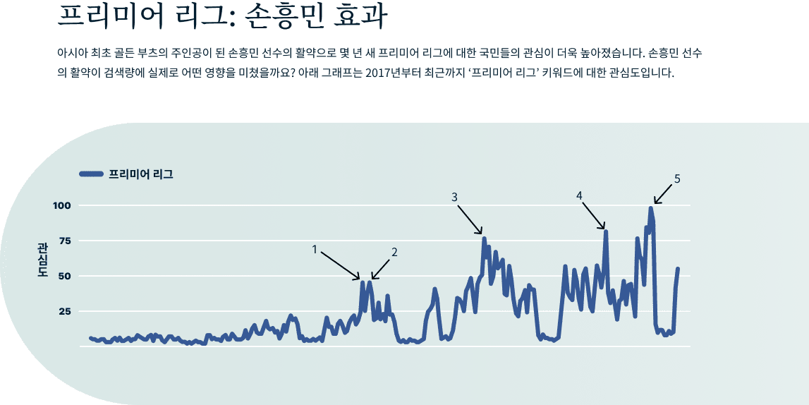2017년부터 5년 사이에 프리미어 리그에 대한 관심도는 눈에 띄게 증가했습니다. 1,3,4번은 손흥민 선수가 가장 좋은 플레이를 펼친 선수인 ‘맨 오브 더 매치'에 선정된 경기들 이었습니다. 2번은 레드카드를 받은 날, 5번은 득점 왕을 결정짓는 2021-22 시즌 마지막 경기 기간이었습니다. 손흥민 선수를 득점 왕으로 만들어준 경기 기간은 5년간 ‘프리미어 리그'에 대한 관심도가 가장 높았던 날이었습니다.