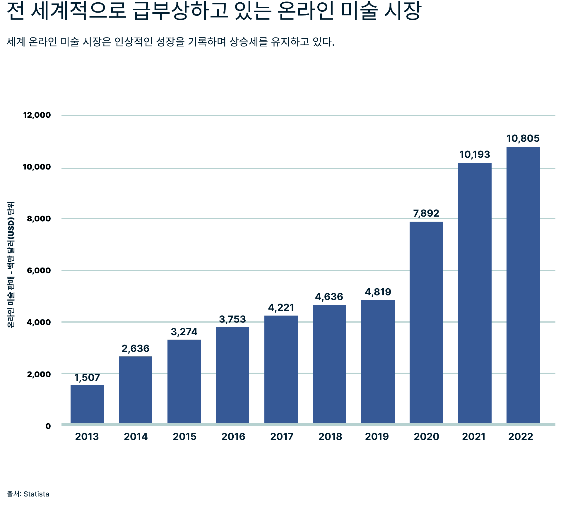 미술품 투자는 포트폴리오를 다양화하고 높은 수익을 창출할 수 있는 유용한 수단이 되기도 합니다. 2022년 한 해 동안만 미술품은 29%라는 놀라운 급등세를 자랑하며 다른 열정 투자 자산군을 능가했습니다. 예술품 매매는 온라인 판매를 통해 무려 108억 달러의 가치를 창출하기도 했습니다.