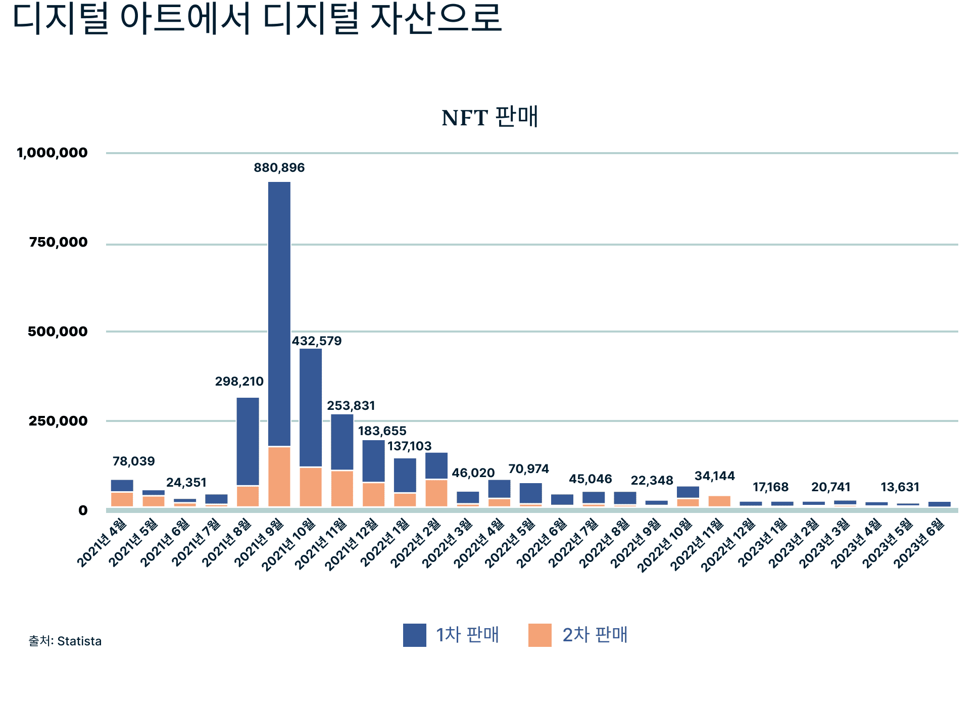 유명인들의 지지와 열렬한 온라인 커뮤니티에 힘입어 2021년 내내 급격한 인기 상승을 겪은 NFT 시장은 2022년 이후 상당한 냉각기를 거쳤습니다. 2022년 1월 정점을 찍은 이후 NFT 거래량은 97% 이상 급감했습니다. NFT는 성공의 정점에서 수백만 달러의 가격을 기록했습니다. 예를 들어, 디지털 아티스트 팍(Pak)의 NFT 아트워크 '더 머지(The Merge)'는 NFT 플랫폼 니프티 게이트웨이에서 무려 9180만 달러에 팔리면서 지금까지 판매된 가장 비싼 NFT 중 하나로 등극했습니다.