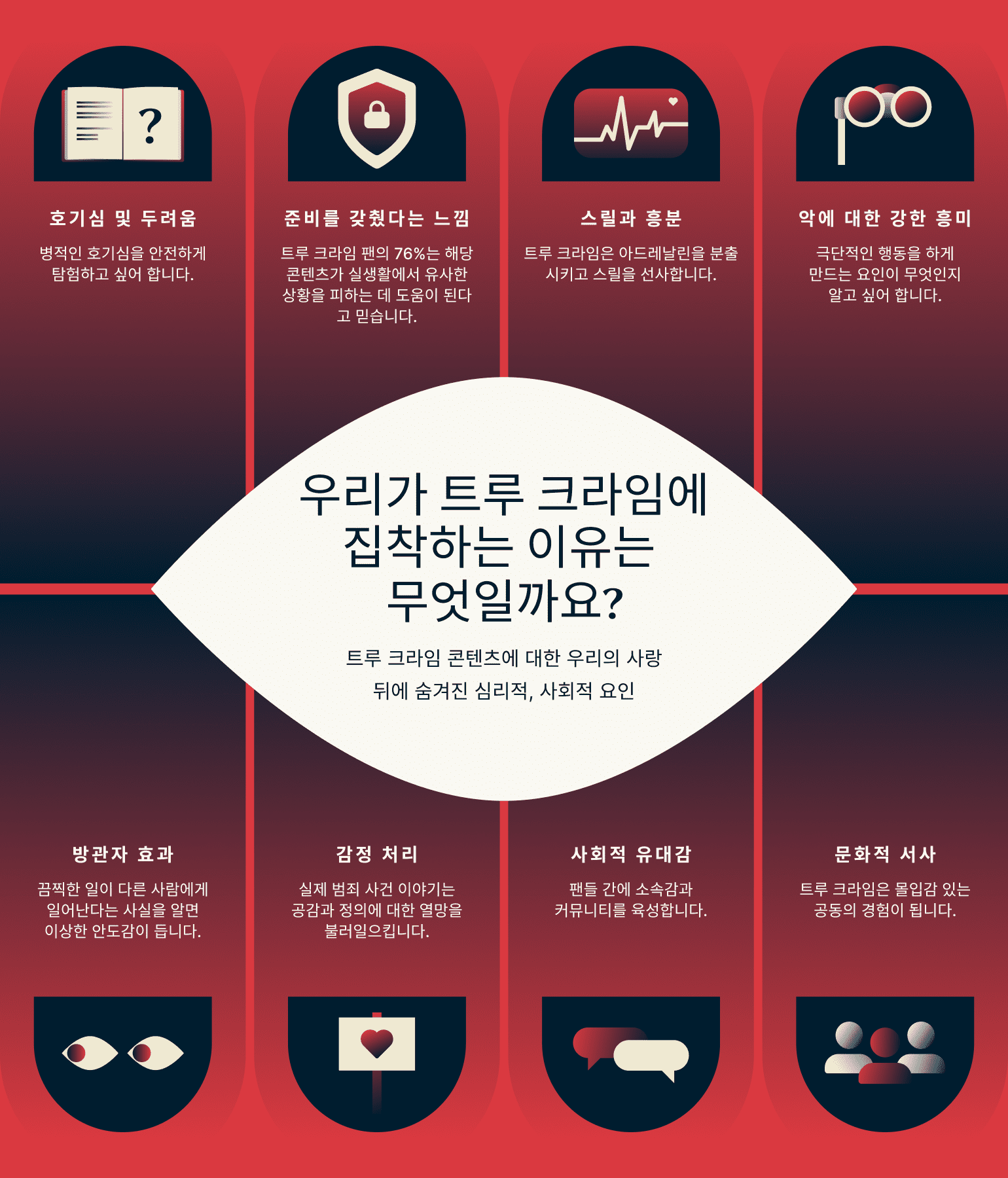 팟캐스트부터 다큐시리즈에 이르기까지 트루 크라임에 대한 우리의 강한 흥미는 국경을 초월하고 문화를 거스르는 것이 분명하며 우리를 최악의 인간 유형에 대한 공통된 호기심으로 하나되게 합니다. 실제로 최근 YouGov 연구에서는 미국인의 50% 이상이 트루 크라임 콘텐츠를 즐기며 35%는 일주일에 한 번 이상 트루 크라임을 시청하는 것으로 나타났습니다. 그런데 트루 크라임의 어떤 점이 우리를 사로잡는 것일까요? 왜 우리는 화면 속 펼쳐지는 이야기에서 눈을 떼지 못하는 걸까요?