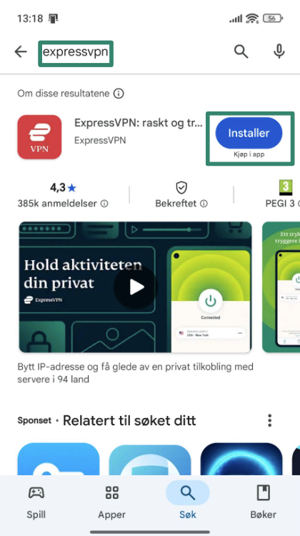 - Søk etter «ExpressVPN» og trykk på «Installer» for å installere appen på enheten din.