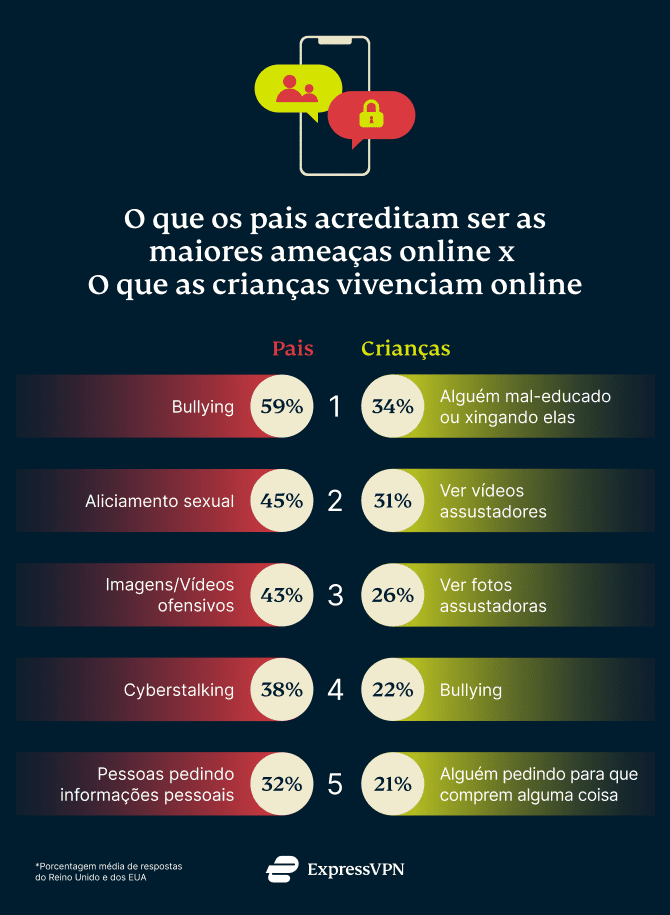 Quando perguntamos aos pais o que eles consideram as maiores ameaças online, 59% dos entrevistados disseram que estavam mais preocupados com o fato de seus filhos sofrerem bullying. Em seguida, surgiram preocupações sobre o fato de o filho ter sido abordado por um predador online, o medo de que o filho pudesse encontrar conteúdo ofensivo online e o risco de perseguição ou assédio cibernética por outros usuários. Mas o que as crianças pequenas dizem que realmente vivenciam online? A maior perturbação para as crianças entrevistadas é encontrar alguém sendo grosseiro ou xingando online (34%), seguido de vídeos e então imagens assustadoras.