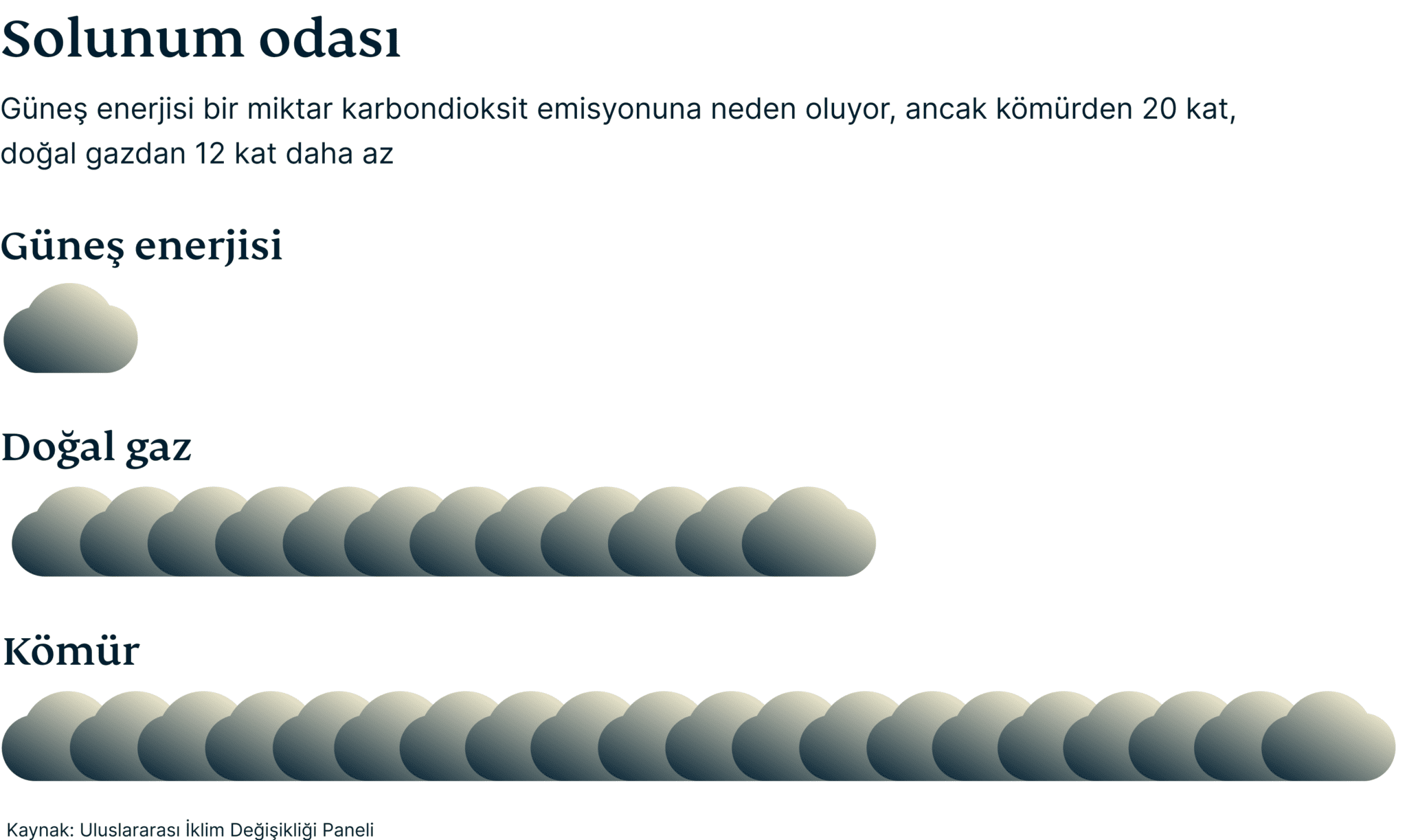 Çevreye olumlu etki. Güneş enerjisi yoluyla enerji üretmek hiçbir zararlı emisyon yaratmaz, ancak güneş panellerini üretmek kirliliğe neden olan enerji gerektirir. Fakat bu yine de ilgili sistemlerin yaşam döngüsü boyunca kömür ve doğalgaz kullanımından kaynaklanan karbon emisyonlarının önemli ölçüde daha az olduğu anlamına gelir. Güneş enerjisi endüstrisi, PV güneş panelleri tarafından üretilen elektriğin, kömür tarafından üretilen elektriğe göre 20 kat, doğal gaz tarafından üretilen elektriğe göre ise 12 kat daha az CO2 ürettiğini tahmin etmektedir.