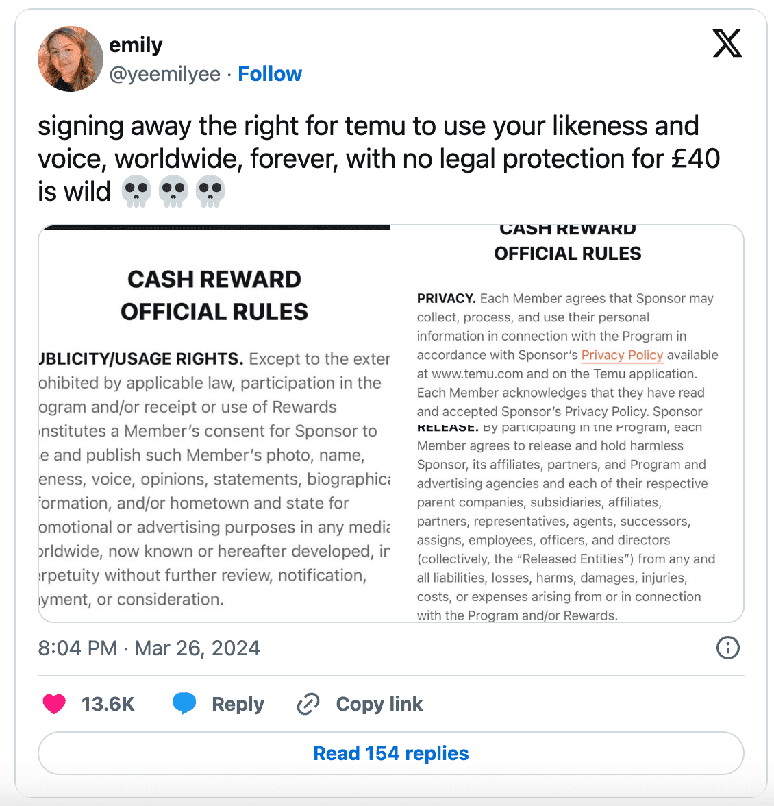 “The excitement of a quick payout can easily overshadow the reality of what you're signing up for,” says Hendry Parsons. “In the case of Temu, the initial terms essentially enlisted users into a lifetime of data sharing, without the explicit, ongoing consent that’s become a cornerstone of digital privacy. Photos, names, and voices were all fair game, creating a reservoir of personal data that Temu could dip into for advertising or even sell to third parties.”