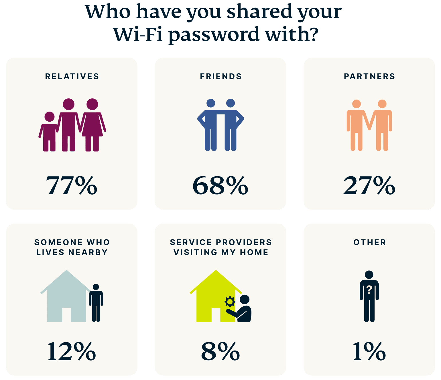 So, who exactly are half of the respondents giving their Wi-Fi passwords to? Our data reveals that individuals are more comfortable sharing their Wi-Fi networks with people they’re close to such as relatives (77%) and friends (68%). Interestingly, only 27% of those surveyed share their Wi-Fi networks with their partners.