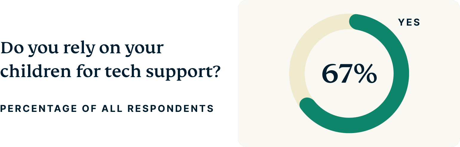 Our survey found that many older adults depend on their families for tech support. About 66% of Gen Xers rely on their kids for help, and this need only grows with age. For Baby Boomers, that number climbs to 69%, and for the older Boomers, it’s 71%.