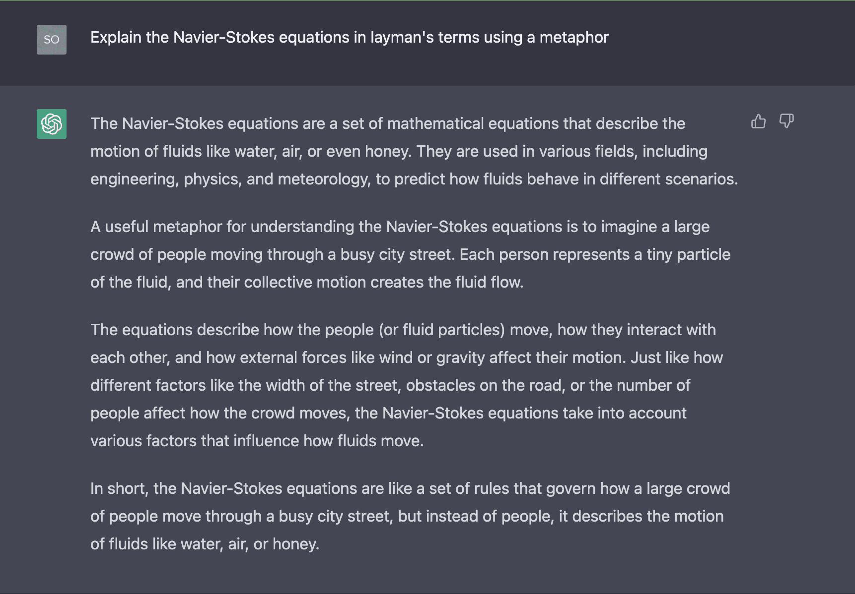 Las analogías y las metáforas pueden ser herramientas poderosas para generar nuevas ideas y comprender temas difíciles y complicados. También pueden ayudarle a ver una nueva perspectiva sobre el tema en cuestión. Por ejemplo, si está escribiendo sobre un concepto matemático complejo, pero le cuesta entenderlo, puede pedirle a ChatGPT que le dé una metáfora que le ayude a comprenderlo mejor.