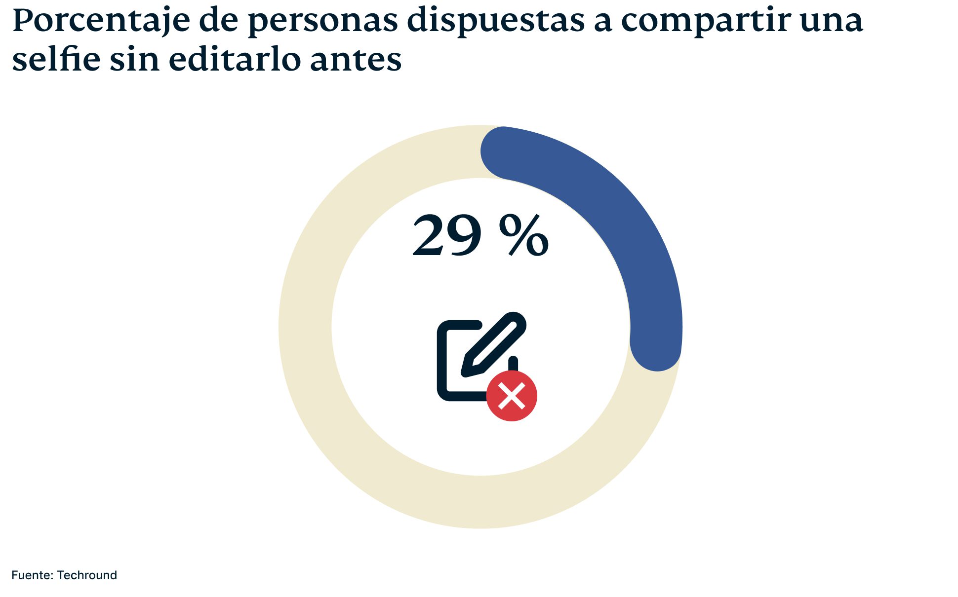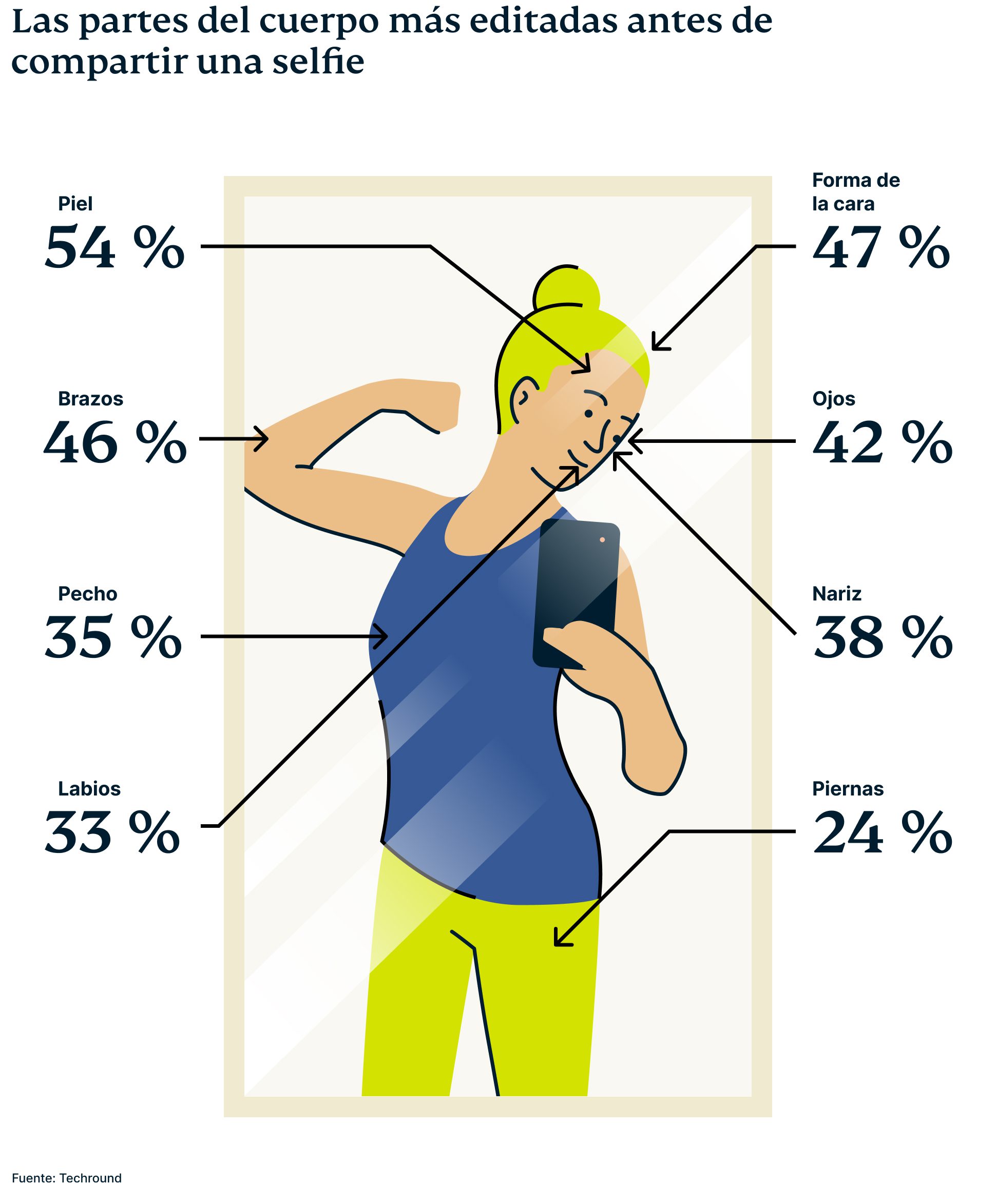 De las personas que editan sus selfies, alrededor del 8 % usan Instagram para ello, mientras que dos tercios usan la aplicación Facetune. Lo hacen para asegurarse de que las imperfecciones en la piel queden ocultas y que se alteren sus rasgos faciales.