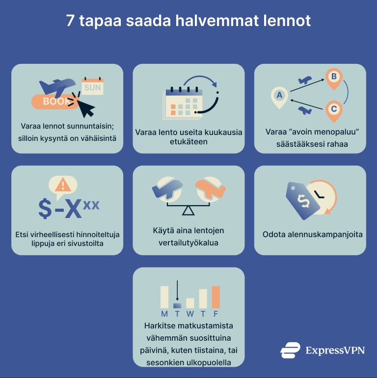 Tyhjennä selaimen evästeet ennen hakua ja etsi lentoja incognito-tilassa. Aseta myös hintahälytykset, osta lippuja sunnuntaisin ja hyvissä ajoin etukäteen, ja harkitse keskellä viikkoa lentämistä. Näiden keinojen ohella voit käyttää myös ExpressVPN:ää vertaillaksesi hintoja eri alueilla ja löytää halvimmat mahdolliset lennot.