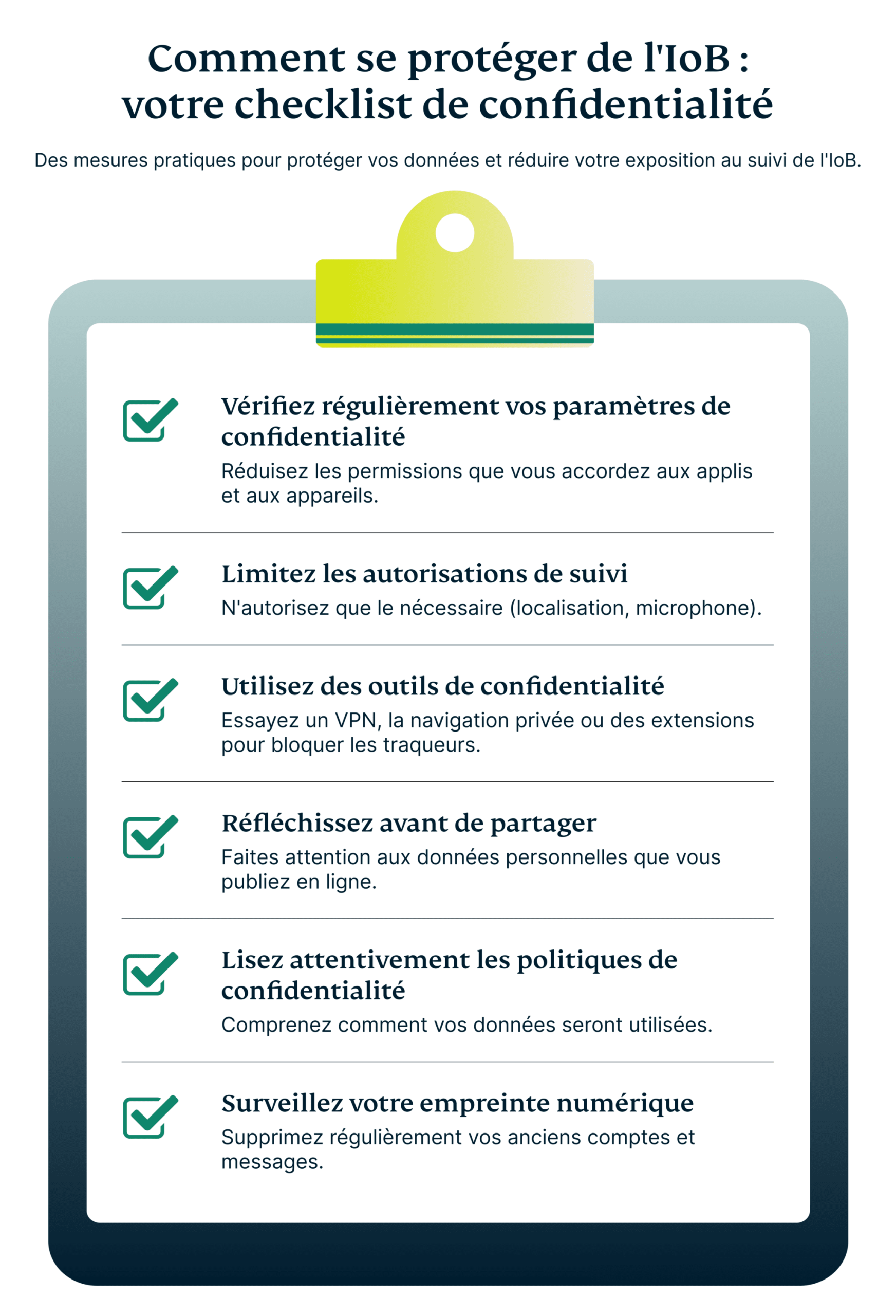 L'IoB se nourrit des données, alors moins il en a, mieux c'est. Avant de publier un contenu sur les réseaux sociaux ou de vous abonner à un service en ligne, réfléchissez à ce que vous partagez. Des informations personnelles comme votre localisation, vos habitudes ou même vos intérêts peuvent tous alimenter votre profil numérique. Ce que vous consultez, qui vous suivez et le type de contenu sur lequel vous cliquez peuvent être utilisés pour vous caractériser et vous cataloguer.