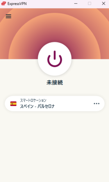 - ExpressVPNのメイン画面が表示されます。中央に大きな電源ボタンがあります。